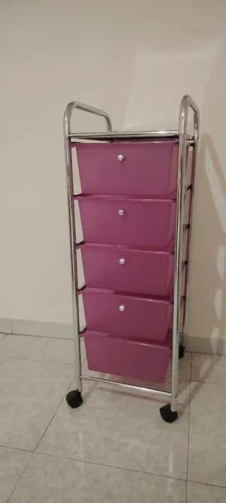 Carrito organizador con cinco cajones y ruedas para facilitar su movilidad. - Estructura metálica. - Cajones de plástico. - Color rosa/morado y plateado. - Medidas 93 cm desde la rueda hasta el asa Cajones de alto 13.05 cm Ancho 28 cm Largo 38.05 NO HAGO OFERTAS