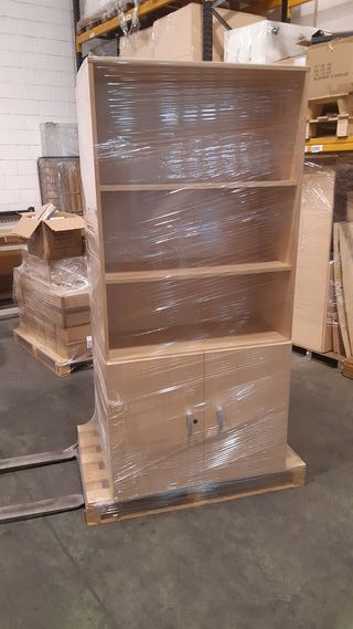 Armario de madera con dos estantes y puertas inferiores. Su diseño en color haya lo hace versátil para cualquier estancia. - Dos estantes amplios. - Puertas con tiradores. - Base de madera.