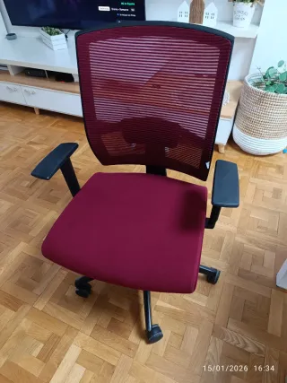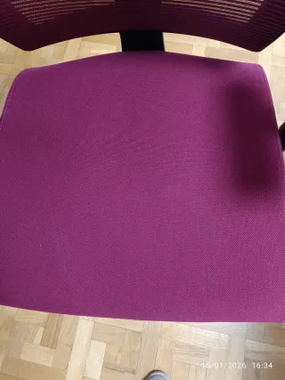 Silla de escritorio con un diseño moderno y cómodo. - Tapicería de tela en color púrpura. - Base y brazos de metal y plástico. - Ruedas para fácil movilidad. Regulación en altura y respaldo Recogida en mano. No se hace envío. El color es granate claro.