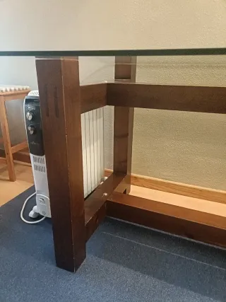 Mesa de comedor. Cristal 160x90. Se pueden desmontar las patas y el cristal para mejor transporte. Patas de madera buena. Urge venta por mudanza. Centro, elegante, robusta, oficina, versátil, moderna, funcional, estilosa, nogal, teka, castaño, cena, exterior, jardín, terraza, rectangular, clásica,