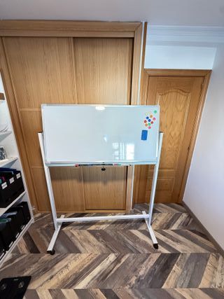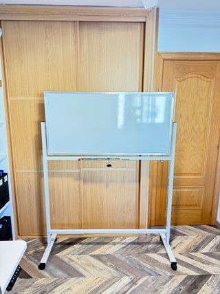 Pizarra blanca magnética con soporte. 120x70cm - Superficie lisa para escribir. - Marco de aluminio. - Soporte con ruedas para fácil movilidad. - Reversible - Rotuladores y borrador incluido