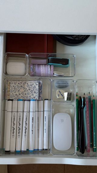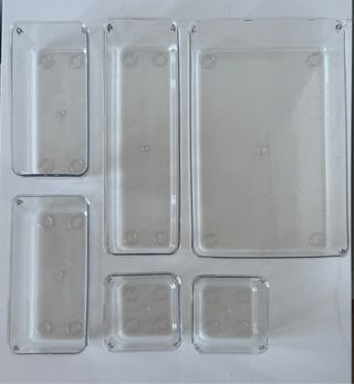 Conjunto de 6 organizadores de cajón transparentes en perfecto estado. Ideales para organizar maquillaje, material de oficina, cocina, baño, escritorio, etc. Medidas aproximadas: • 1 grande: 25 x 18 cm • 2 medianos: 25 x 8 cm • 1 estrecho: 22 x 7 cm • 2 pequeños cuadrados: 8 x 8 cm Plástico resistente Transparentes para ver todo fácilmente Incluye adhesivos antideslizantes Encajan entre sí y se adaptan a distintos cajones Se venden en conjunto. Solo por wallapop nada de whatsapp ventas serias.