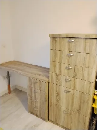 Conjunto de escritorio con cajonera a juego. Ideal para organizar tu espacio de trabajo o estudio. - Diseño moderno con acabado en madera. Forrada con vinilo efecto madera. - Cajonera con varios cajones para almacenamiento. Escritorio 130x50x75 Cajonera 70x45x140