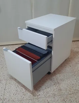 Cajonera de hogar/oficina con ruedas y 16 carpetas colgantes incluidas. Marca Ikea, lacada en blanco con tiradores metálicos. Tiene dos cajones. El superior 7 cm de alto útiles y el inferior de 35 cm de alto. Medidas: alto 63 cm, ancho 40 cm, fondo 51 cm.