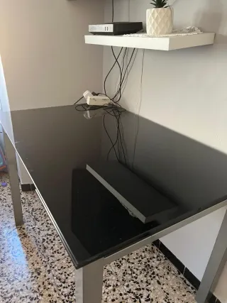 Vendo mesa de cristal color negro, en perfecto estado. Mide 1,10 m de largo pero se puede extender hasta 1,70 m, ideal para comidas o reuniones. Ha tenido muy poco uso, prácticamente nueva. Perfecta para salón, comedor u oficina. Entrega en mano.