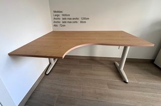 Mesa de oficina con un diseño angular y moderno. Sus patas metálicas le dan estabilidad y un toque contemporáneo. - Largo total: 1600cm - Ancho lado más ancho: 1200cm - Ancho lado más corto: 80cm - Altura: 72cm