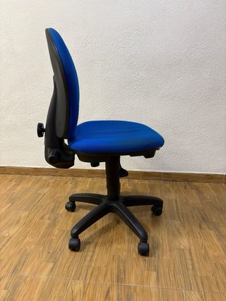 Silla de oficina con un diseño moderno y funcional. Su tapicería de tela ofrece comodidad para largas jornadas de trabajo. - Base de plástico resistente con ruedas. - Respaldo ergonómico. - Tapizado azul. - Ajustable, regulable.