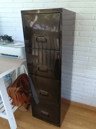 Archivador metálico de cuatro cajones. - Diseño de cuatro niveles. - Tiradores integrados en cada cajón. - Acabado en color marrón oscuro.