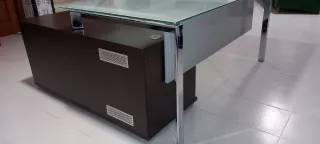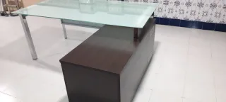Elegante mesa de oficina, o de recepción, con tablero de cristal doble de 12 milímetros de espesor total. Mueble de madera color nogal o similar, con cajonera con llave y archivador/estantería con puerta corredera. Este mueble auxiliar se puede colocar como en la fotografía o en línea con el tablero de cristal. - Diseño moderno y funcional. - Estructura y patas cromadas metálicas y resistentes. - Medidas: tablero 169,5 x 88,5 centímetros mueble 125,5 x 54 centímetros composición 169,5 x 143,5 cent