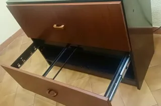 Mueble archivador con dos cajones, ideal para organizar documentos. Se entrega en la calle, te lo bajamos nosotros. - Acabado en madera oscura. - Diseño moderno y funcional.