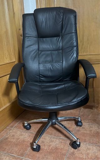 Silla de oficina con un diseño moderno y ergonómico. - Tapicería de piel. - Base con ruedas para fácil movilidad. - Respaldo alto y moldeable para mayor comodidad.