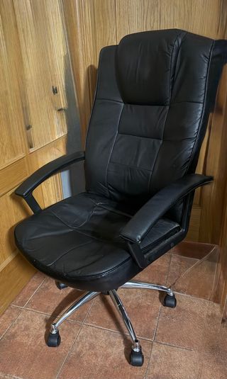 Sillón de oficina con un diseño ergonómico y cómodo. - Tapicería de piel sintética. - Base con ruedas para fácil movilidad. - Brazos acolchados. Nota: tiene desgaste en la zona de la espalda, como se puede observar en la foto, por lo demás en buenas condiciones.