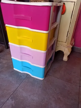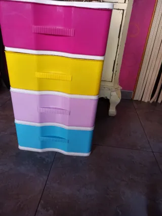 Práctica cajonera de almacenamiento con 4 cajones de colores vivos. Ideal para organizar diferentes objetos en casa o la oficina. - Diseño apilable. - Tiradores integrados en cada cajón. Dimensiones aproximadas: Alto : 65 cm Fondo : 38 cm Ancho : 37 cm