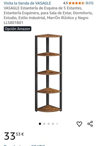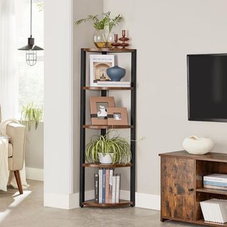 Estantería esquinera VASAGLE estilo industrial en marrón rústico y negro, fabricada en tablero de aglomerado y estructura de acero resistente. Diseño compacto de 30 x 30 x 129,5 cm ideal para aprovechar esquinas en salón, dormitorio, oficina o cocina. Dispone de 5 estantes con 30 cm de distancia entre niveles, soportando hasta 5 kg por estante. Incluye patas ajustables para mayor estabilidad y 2 kits antivuelco para fijación a pared. Montaje sencillo con piezas numeradas y herramientas incluidas. Peso 6 kg. Solución funcional, robusta y decorativa para optimizar espacio vertical.