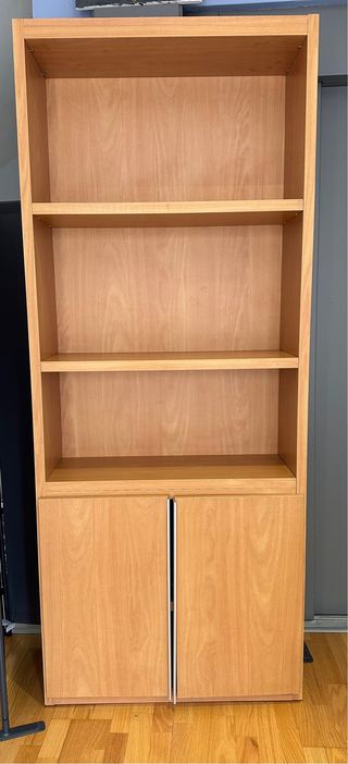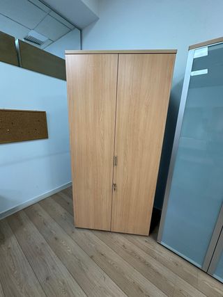 Armario de oficina con puertas y estantería interior. Su diseño es moderno y funcional. - Acabado en madera clara. - Dos puertas con tiradores y cerradura. - Estantería interior para organización.