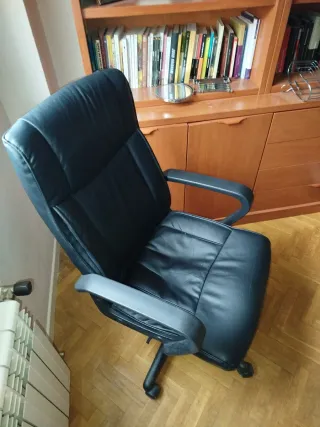 Sillón directivo/ silla con ruedas giratorio, para oficina. Eco-piel negra y altura ajustable. Nuevos y sin signos de uso. 4 sillas. se pueden comprar por pares. Cada silla, 150€. Medidas: respaldo 46cm, asiento 46x43 Recogida en Alcalá de Henares.