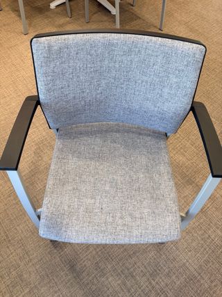 Conjunto de sillas de oficina con un diseño moderno y elegante. - Tapicería en tela gris. - Estructura y brazos en metal negro.