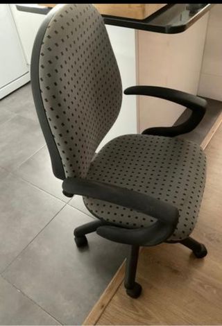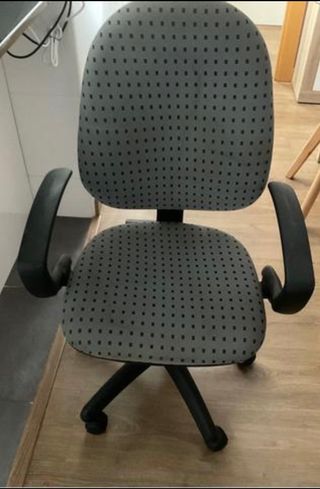 Silla de oficina funcional 100 %. . Tapizado con señales de uso pero en buen estado. - Base y estable y de cinco ruedas. - Respaldo ergonómico. - se puede ajustar altura con pistón (sube sola), inclinación del respaldo y dureza de éste. Solo venta en mano.