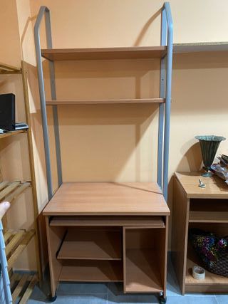 Conjunto de dos estanterías, dos mesas auxiliares con bandeja extraíble, mesa cuadrada con bandeja extraíble y un escritorio de la misma madera. Escritorio: 140x80; PRECIO: 100 Mesa auxiliar: 82x54 PRECIO mesa + estantería: 100 Mesa cuadrada: 80x80; PRECIO: 40