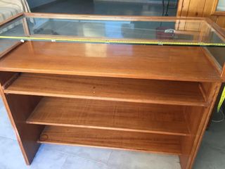 Mostrador tienda de madera y cristal con expositor y balda extraíble y mueble auxiliar para caja registradora u ordenador. medidas mostrador: 117x45,5 altura: 95 medidas mueble auxiliar: 57x57 PRECIO: 325 (ambos)