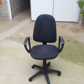 Se vende silla de oficina giratoria. Es de color negro y está fabricada con tejido. Tiene un pequeño agujero de cigarro en el asiento y hay que limpiarla no hago envíos - Tiene reposabrazos. - Se encuentra en buen estado, aunque presenta algo de polvo.