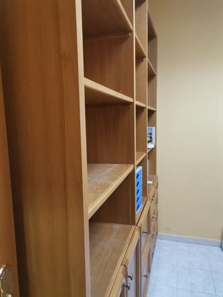 Conjunto de muebles de oficina en buen estado. Ideales para una oficina pequeña o despacho. **Se hace buen precio, consultar** *Se pueden vender juntos o separados* - Incluye dos escritorio en forma de L y tres estanterias: una de ellas de cristales y puertas y las otras dos de baldas - El escritorio es de madera y color marrón con detalles grises. - La estantería combina madera y cristal, ofreciendo un espacio de almacenaje amplio.
