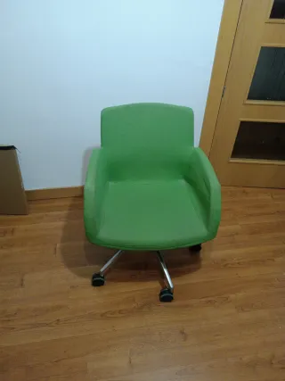 Silla de oficina giratoria. Se encuentra en buen estado salvo algún arañazos en los reposabrazos. Las ruedas y la palanca para subir y bajar el asiento funcionan perfectamente. El único inconveniente que tiene es que el respaldo no se mantiene recto cuando te apoyas, se va un poco hacia atrás. - Estructura resistente de metal y nylon. - Acolchado de cuero sintético. - Respaldo de malla transpirable.