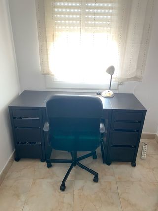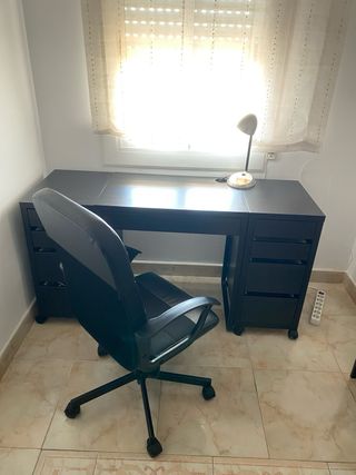 Mesa de escritorio con un diseño moderno y funcional. - Amplia superficie de trabajo. - Dos módulos de cajones para almacenamiento. - Acabado en color negro. Silla no incluida