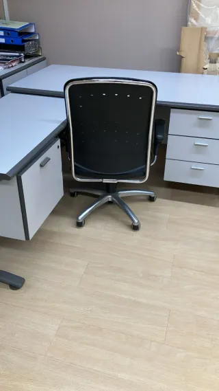 Silla de oficina con un diseño moderno y funcional. Esta desmontada para mayor comodidad. No le pasa nada, se vende por reforma. - Asiento y respaldo tapizados en tela. - Base metálica con ruedas.