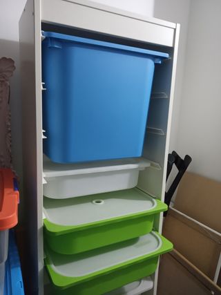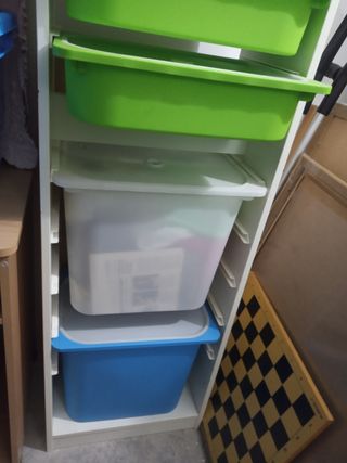 Sistema de almacenaje en cajones de plástico con tapas. - Estructura de plástico resistente. - Diseño en tonos azul y verde.