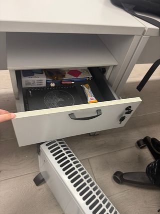 Mesa de oficina con un diseño moderno y funcional. - Combinación de colores gris y blanco. - Fabricada con materiales resistentes. - 2m x 1m - perfecto estado Otros: - cajoneras 30€ - Sillas 15€ - muebles almazenaje 40€ - Mesa presidencial de madera 180€ - Sillas recepcion 40€ - mesitas de cristal 50€ Vendo todo antes del 29 de enero.