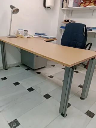 Mesa de oficina angular con un diseño moderno y funcional. - Superficie de madera clara. - Estructura metálica resistente. - Cajonera gris de tres cajones. está totalmente nueva y quiero sacarla rápido así que, sin pasarse, porque no la regalo, pero escucho ofertas serias