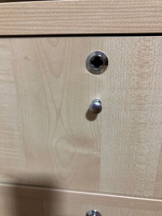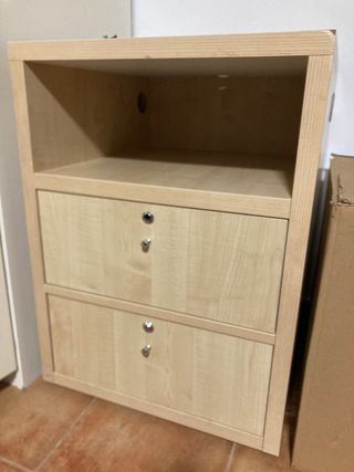 Conjunto de dos mesitas de oficina en color haya. Perfectas para complementar tu espacio de trabajo. - Diseño moderno y funcional. - Acabado en madera clara. -Le falta la cerradura 15€ la unidad