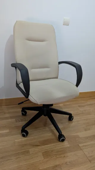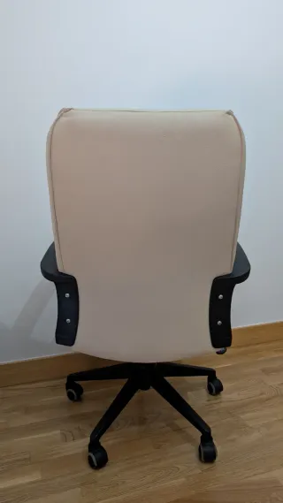 Silla de oficina con un diseño moderno y funcional. - Tapicería de tela en color beige. - Brazos y base de plástico en color negro. - Ruedas para facilitar el desplazamiento. Defecto en una rueda que se puede cambiar. El gas a veces hace que baje la silla.