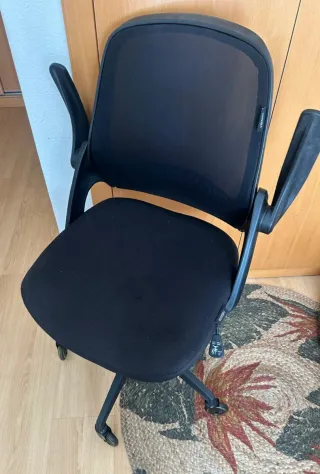 Se vende silla de oficina. Es una silla giratoria, de color gris oscuro, con respaldo de malla y reposabrazos. Está en buen estado. - Respaldo de malla transpirable. - Reposabrazos incluidos. - Base giratoria. -precio en tienda se compró en 159 euros -Nunca se uso guardado de un año