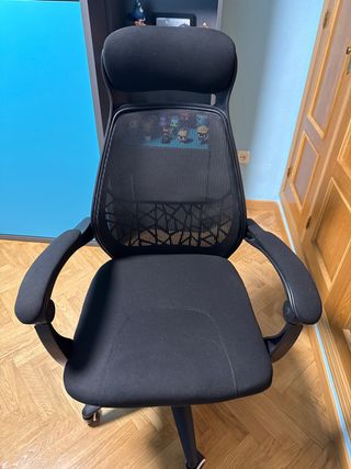 Se vende silla de oficina. Es negra y está en muy buen estado. Prácticamente nueva. - Diseño ergonómico para mayor comodidad. - Estructura resistente. - Tapizado de tela suave y transpirable. - Incluye reposacabezas.