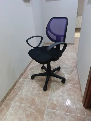 Silla de oficina con respaldo de malla transpirable y asiento acolchado. - Respaldo con malla púrpura. - Base de cinco ruedas para fácil movilidad. - Reposabrazos curvos. - Posición graduable de altura