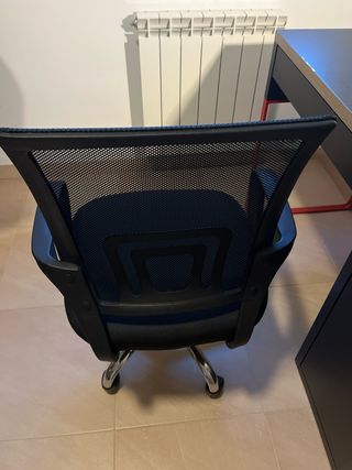 Se vende silla de oficina giratoria. Es cómoda y práctica para trabajar. - Tiene ruedas para facilitar el movimiento. - El respaldo es de plástico negro y el asiento de tela azul. - Está en buen estado, aunque tiene algunas marcas de uso.