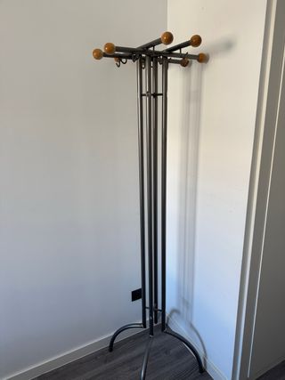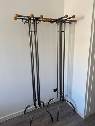 ESCUCHO OFERTAS RAZONABLES por uno o por los dos juntos (no regalo, no son gratis) 2 percheros de pie con un diseño moderno y funcional. Estructura principal en metal. Detalles decorativos (pomos) en madera. Base estable con patas curvas. Con tapas de plástico en las patas. Uno de ellos no tiene 2 de los topes de madera, como se ve en las fotos. Tienen uso pero están estupendos Medidas aprox.: 180 x 52 x 52 cm Perfecto para oficina, habitación, dormitorio, sala de espera, sala de estar.