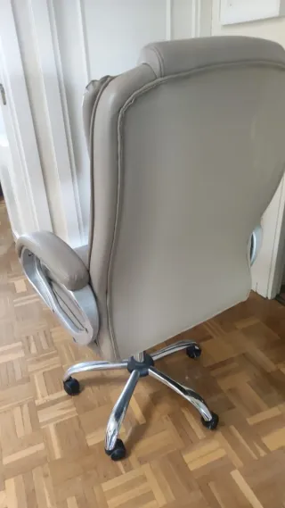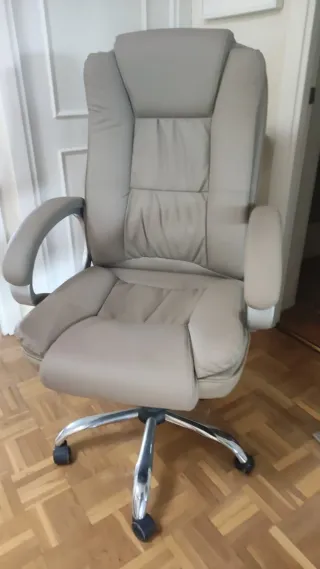 Silla de oficina de piel sintetica, respaldo reclinabe y altura ajustable. En color crema. Muy comodo. La piel esta cuarteada como se puede ver en la foto.