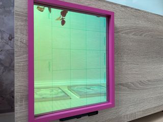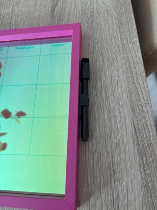 Pizarra con marco rosa y superficie de cristal con diseño de calendario. - Marco de plástico resistente. - Superficie de cristal con cuadrícula. - Diseño moderno y funcional. - Se puede colgar tambien