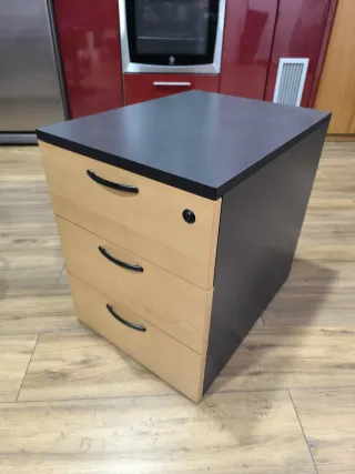 Conjunto de muebles de oficina con acabado en madera y metal. Son prácticos y seguros. - Cajoneras con cerradura. - Diseño funcional para espacios de trabajo. - Con ruedas. - el cajón superior, en ambos, incluye bandeja de plástico. El cajón inferior es para carpetas colgantes de archivo. El precio incluye las dos unidades. No se venden sueltos