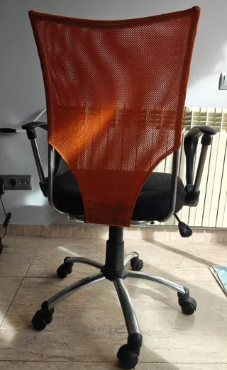 2 Sillas de oficina con un diseño moderno y funcional. - Respaldo de malla naranja. - Asiento acolchado negro. - Base con ruedas para fácil movilidad. - Patas Cromadas - 5 ruedas El precio es por las 2 Sillas No dispongo de mucho tiempo libre y suelo contestar al final del día o los fines de semana.