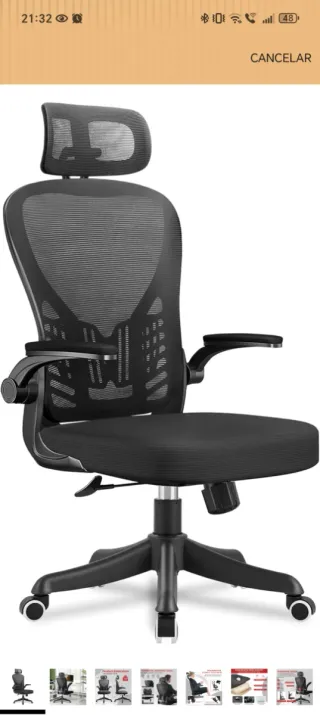 Silla de oficina con un diseño moderno y cómodo. - Respaldo de malla transpirable. - Asiento acolchado. - Brazos ergonómicos. - Base giratoria con ruedas. Desperfecto: el respaldo se echa mucho hacia atrás. No caerías (es seguro) pero se inclina bastante.