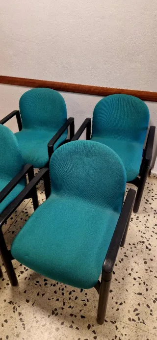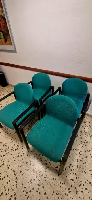 Conjunto de cuatro sillas de visita para oficina. Diseño resistente, para ofrecer comodidad y un estilo moderno. - Tapicería de tela color verde. - Estructura de madera ,plástico y cuero. - Buen estado de conservación. Precisan de una buena limpieza y quedarían como nuevas. Se venden por cierre de oficina. Recogida presencial en Terrassa en la zona de Pueblo nuevo.