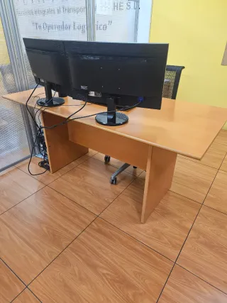 Mesa de oficina con tablero de haya y estructura de acero. - Diseño moderno y funcional. - Mesa muy robusta, usada con dos ordenadores, monitores, soportes, tablets, disco extrenos, telefono, microfono, cascos y material oficina, trabajando dos persona a la vez. - Vendo por usar ahora mesas elevables. - Ultima foto es mesa similar en Amazon. - Como nuevo, excepto por una marca que se puede ver la penúltima foto.