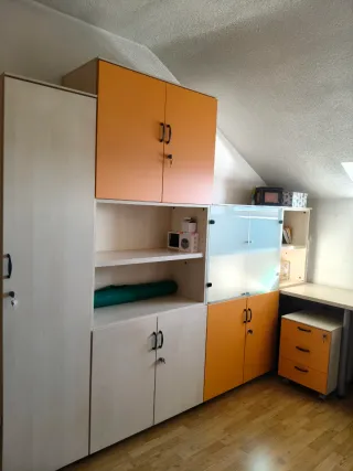 Conjunto de muebles de estudio y oficina, ideal para organizar tu espacio de trabajo. Total medidas mueble: 2,70 metros largo y de fondo 42,50 cm Primer mueble: 1,98 alto x 45 cm ancho Segundo mueble: 2,17 altox90 cm ancho Tercer mueble: 1,47 altox90 cm ancho Cuarto mueble: 1,47 altox45 cm ancho Cajonera: tres cajones, 57 cm altox42 cm ancho Encimera total largo: 240 cm Todos los muebles con llave