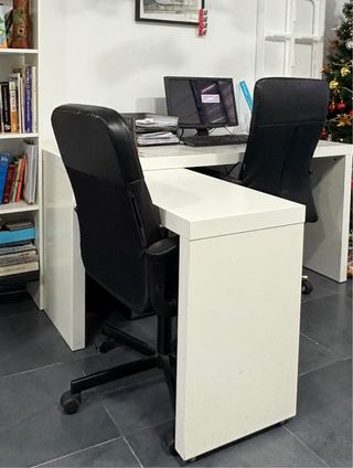 Escritorio extraíble de diseño moderno minimalista - Color blanco. - Material melamina -Tiene huecos detras para pasar cables -Tiene ruedas en el extraible - Se adapta a espacios reducidos -Muy resistente -Ideal para trabajar dos personas