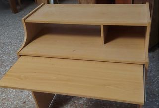 Mesa de escritorio de madera en buen estado. Diseño elegante y moderno. - Superficie amplia y cómoda para trabajar. - Estantes laterales para almacenamiento. - Perfecta para una habitación u oficina.