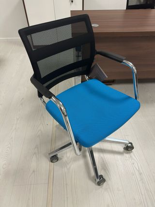 Se vende silla de oficina. Es una silla elegante y cómoda, ideal para el trabajo o el estudio. Respaldo de malla con cinchas de refuerzo. Muy duradera. A estenar. - Estructura metálica resistente. - Asiento de tela azul. - Respaldo de malla transpirable.